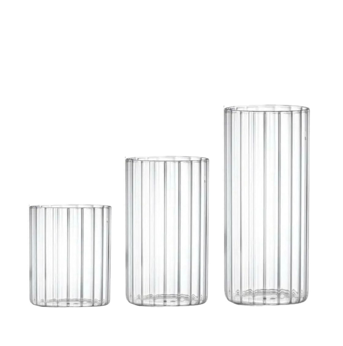 Stikliniai cilindrai, raštuoti vertikaliom juostelėm. Gali būti naudojami kaip vazos gėlėms arba kaip žvakidės.