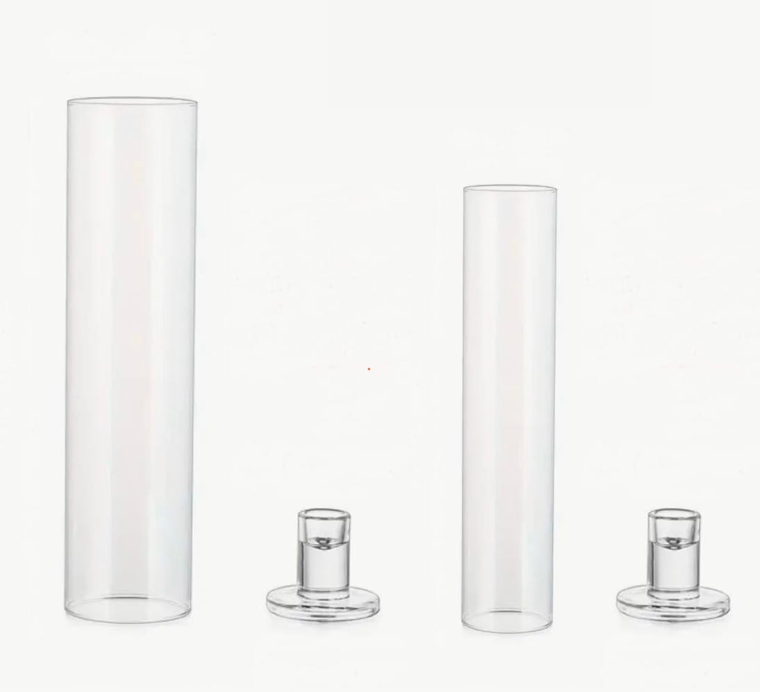 Stiklo žvakidės su skaidraus stiklo gaubtu ilgoms žvakėms .
